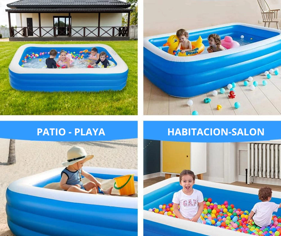 ✅ Material resistente y ecológico ✅ Capacidad amplia para toda la familia ✅ Base antideslizante y borde de seguridad ✅ Inflado y desinflado rápido ✅ Diseño elegante que realza cualquier espacio